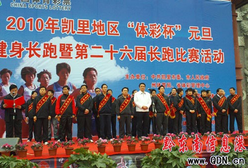 本港訊 (記者 廖強 攝影報道)2010年1月1日,凱里地區“體彩杯”元旦健身長跑暨26屆長跑比賽活動在凱里市體育館舉行。黔東南州州委書記廖少華,州委常委、凱里市委書記楊正明,州委常委,宣傳部長耿生茂,副州長劉曉春等領導也來到現場參加此次長跑健身活動。上午9點,隨著黔東南州州委書記廖少華一聲槍響,長跑活動正式開始。