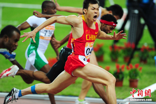 22日晚,廣州亞運會田徑男子100米決賽中,中國選手勞義奪得金牌。中新社記者陳文攝