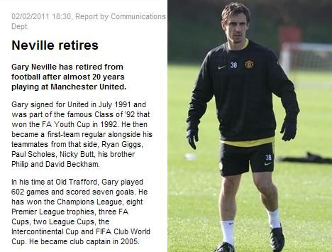 曼聯(lián)在官網(wǎng)聲明中稱:“在幾乎20年的曼聯(lián)生涯后,加里-內(nèi)維爾已經(jīng)正式退役。”