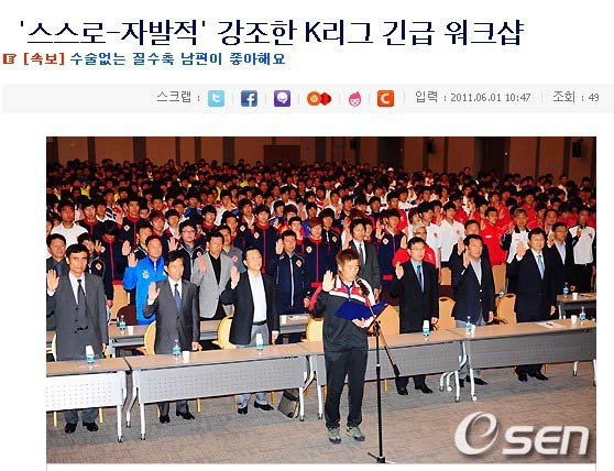 昨日,韓國足壇1000千余名教練員和球員代表出席會議,共同商討懲治賭球假球的對策,會議日程持續兩天,足見韓國足壇對此次事件的重視,會上,特備是對于前國家隊球員金東炫以及大田市民中多名球員被逮捕的事件,韓國足壇一片惋惜。