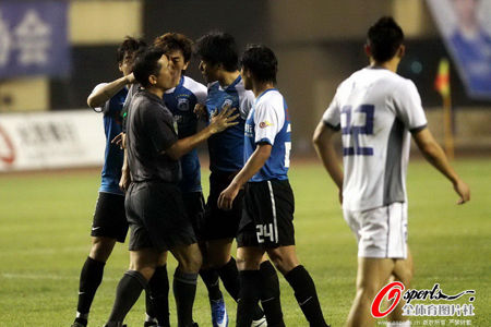 大連實德1-1戰平天津泰達,李智超進球后被紅牌罰下,于大寶將比分扳平,此后陳濤也被罰下,曹陽終場前罰失點球。