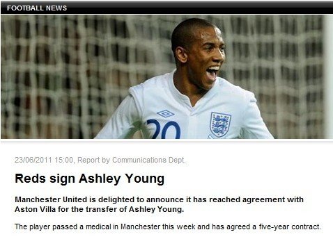 騰訊體育訊 北京時(shí)間6月23日,曼聯(lián)通過(guò)官方網(wǎng)站宣布,正式簽下阿斯頓維拉邊鋒阿什利-揚(yáng),25歲的阿什利-揚(yáng)與曼聯(lián)簽訂了一份為期5年的合同,到2016年6月結(jié)束。
