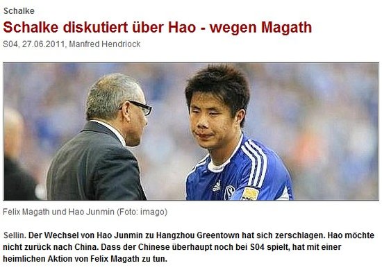《西部匯報》關于蒿俊閔的最新報道以“因為馬加特(在俱樂部不知情的前提下與其續約),沙爾克重新討論蒿的去留問題”為題稱:“沙爾克04球員蒿俊閔轉會中超杭州綠城的路被徹底堵上,蒿不想返回中國踢球。這位中國球員在俱樂部不知情的前提下,與前任主帥馬加特秘密續約!”前段日子,眾多國內媒體曝出蒿俊閔加盟綠城只差簽字的消息,但按德媒的說法:俱樂部欲盡快為陣容瘦身,但將小蒿拋售給綠城只不過是一廂情愿。