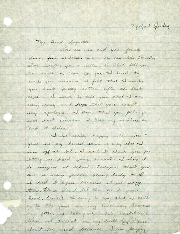 2004年12月,就有人以510066美元的價(jià)格拍賣喬丹的這封求愛(ài)信,但直到今天信的內(nèi)容才被公布出來(lái)。喬丹在信中向他“最愛(ài)的拉奎特”道歉說(shuō),他讓自己心愛(ài)的姑娘“看起來(lái)很糟糕”,然后喬丹開(kāi)始贊美她的美麗,明確的解釋說(shuō)當(dāng)時(shí)他只是和她開(kāi)玩笑,并向這位姑娘表達(dá)了“他最深切的愛(ài)”。在信的末尾,喬丹還工整的簽上了自己的全名。以下是喬丹高中情書(shū)的詳細(xì)內(nèi)容: