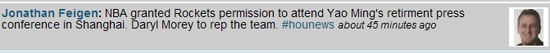 費根在Twitter上如此寫道:休斯頓火箭隊日前已經獲得NBA的許可,而達瑞爾-莫雷將代表球隊,出席姚明在上海舉行的新聞發布會。