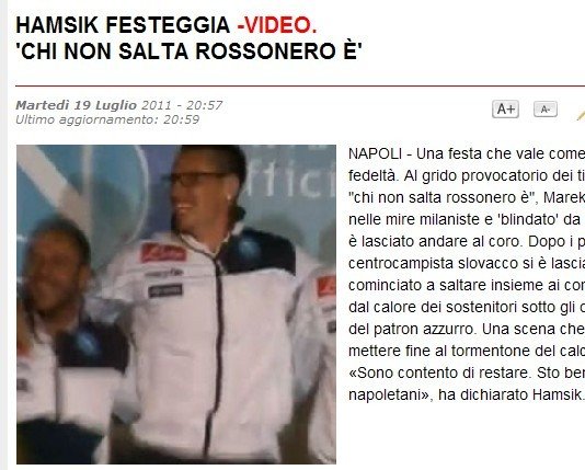 本周那不勒斯隊集結后哈姆西克亮相,斯洛伐克人在新賽季的新聞發布會上明確表示,今夏他不會離開球隊。“回到球隊重新集結使我感到非常高興,新賽季有新的目標在等著我們,我很榮幸能繼續留在球隊效力,我在那不勒斯踢球的感覺很好。”《共和報》稱發布會當天哈姆西克最初的情緒還不是太好,但在和主席德勞倫蒂斯溝通后,他也加入到了隊友和球迷組織的PARTY中,《天空電視臺》記者證實,當時這一群那不勒斯球迷口中唱的竟然是“不跳槽去AC米蘭!”短暫的猶豫后哈姆西克也加入到其中又唱又跳,顯然,他已經接受了今夏繼續留在球隊無法加盟紅黑軍團的事實。