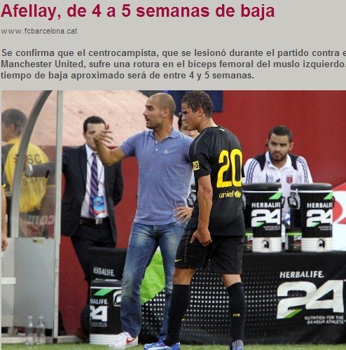 在結束不久的巴薩與曼聯的友誼賽中,巴薩最終1比2不敵爵爺弗格森率領的紅魔。在那場比賽中荷蘭中場阿費萊代表巴薩首發出場,但是在比賽的第43分鐘就被替換下場。而在今天巴薩官方則發表聲明稱阿費萊在與曼聯的友誼賽中受傷。