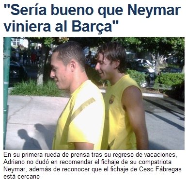 巴薩距離簽下小法無限接近,這不是新鮮事,因?yàn)橐惶烨肮系蠆W拉剛剛親口透露過,阿德里亞諾這次透露的最重要消息是他替巴薩拆了皇馬的臺(tái)。出乎西班牙媒體的意料,阿德里亞諾在接受采訪時(shí)透露了他游說內(nèi)馬爾不要加盟皇馬、轉(zhuǎn)而投奔巴薩這一重磅內(nèi)幕:“我已經(jīng)告訴內(nèi)馬爾了,希望他不要加盟皇馬,來我們巴薩�!�