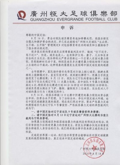 騰訊體育訊 在一次申訴無果而終的情況下,廣州恒大俱樂部向中國足協提出了二次申訴,欲根治中國足壇的暴力惡行。在廣州恒大的二次申訴中,其針對與遼寧宏運的比賽中出現的錯判、漏判提出了嚴重質疑。同時在二次申訴中,廣州恒大要求中國足協對遼寧宏運隊員肇俊哲處以終身禁賽的處罰,對當職主裁判馬寧處以終身禁哨的處罰。