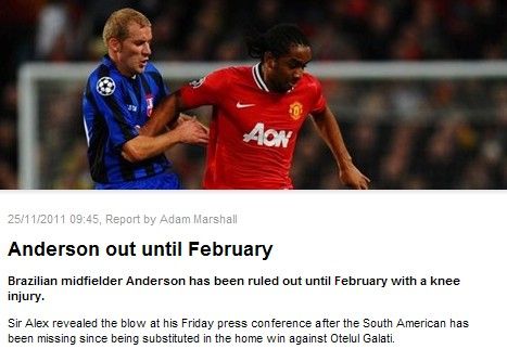 曼聯的中場則遭遇傷病重擊,歐冠對加拉迪受傷的安德森面臨大休,“克萊維利和安德森打不了,安德森傳出壞消息,我們認為他要一直缺陣到明年2月。他的膝蓋受傷了,我們讓他回葡萄牙問診,他接受了上一次為他做膝蓋手術的醫生的檢查。檢查結果對我們來說是個打擊,我們沒預想到他會缺陣這么久。因此,我們將會有一段時間缺少這兩名中場。”