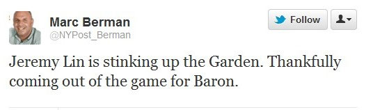 這種詆毀和攻擊,從今天比賽第三節就開始了。當林書豪連續出現了2次失誤之后,《紐約郵報》的記者馬克-伯曼寫道,“林書豪讓麥迪遜廣場花園‘臭氣熏天’,終于,他被巴隆-戴維斯換下場了。”