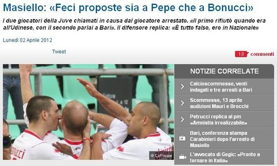 而博努奇的經紀人則斷然否認了A-馬謝羅的指控,“他所說的一切都是虛假的。因為在巴里對烏迪內斯的比賽前一周,博努奇都一直在意大利國家隊集訓營中,他根本不可能事先得知這些賭球建議。”