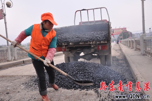 1月16日,記者在省道202天柱縣境內看到,一輛輛工車程穿梭運輸,十余名工人鋪撒瀝青混合土,壓路機來回緩緩碾壓,天柱公路段工人正冒著嚴寒搶修天柱橋。