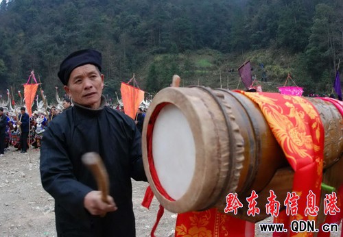 一苗族男子在敲擊木鼓