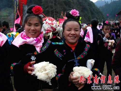 兩名參加跳木鼓舞的苗族女子在蘆笙場得到免費發放的糯米飯