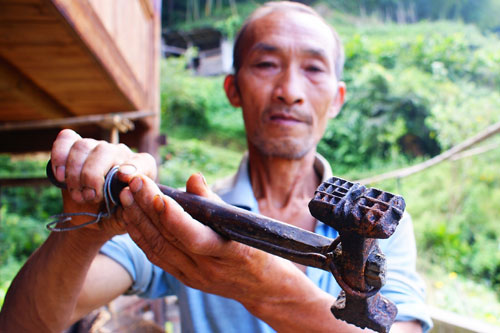 據金陽時訊消息 9月16日,錦屏縣一位村民在展示一把200多年前的“斧印”。