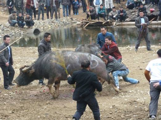 最后是“東道主A1號”和“烏流寨A28號”決斗,雙方打得難解難分,抵命相抗。但“東道主A1號”幾次都用牛角把“烏流寨A28號”的頭臉高高挑起,“烏流寨A28號”卻頑強地抵抗,而傷越來越重,終因體力不支而落荒而逃。
