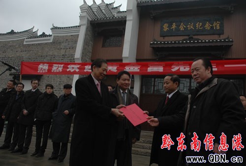 懷著對革命先烈、黎平侗鄉革命老區的緬懷之情和深情厚意,在州委常委、州政法委書記、州人民政府副州長張仕福等領導的陪同下,黃金富先生親臨了黎平會議紀念館。圖為黃金福先生向中共黎平縣委書記閔啟華捐贈的情形。