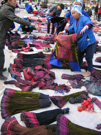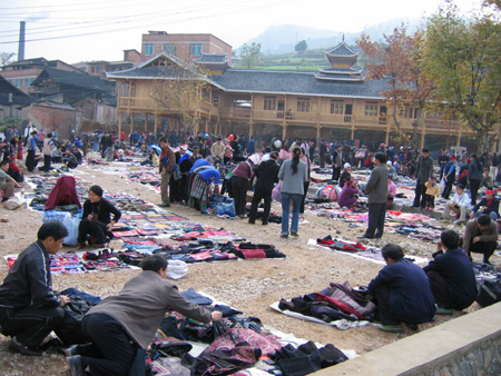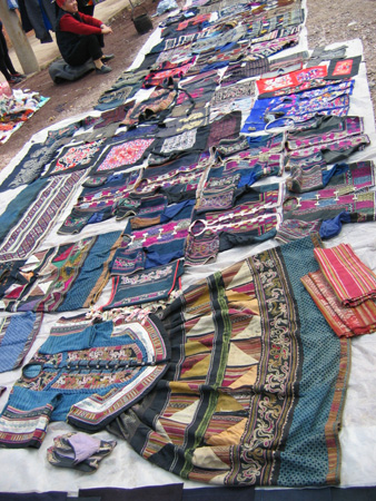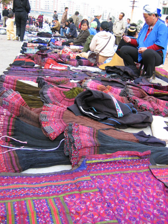 本港訊 琳瑯滿目擺放街頭出售的少數民族服飾品讓人眼花繚亂。在凱里民族商貿街,有一處專門出售地方各少數民族服飾的市場,每逢周末,到此擺攤銷售的商販少則數百人,多則上千人。前來選購服飾品的大多是慕名前來的外地游客。