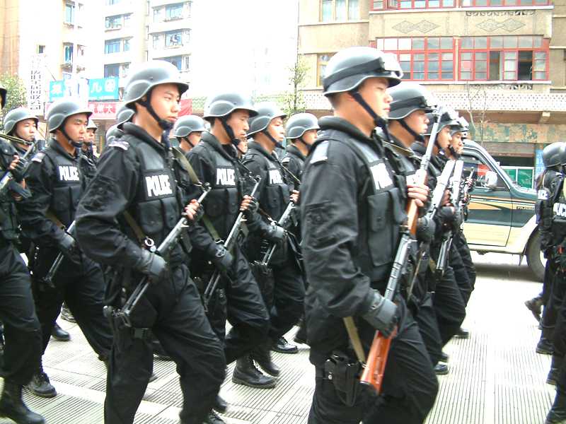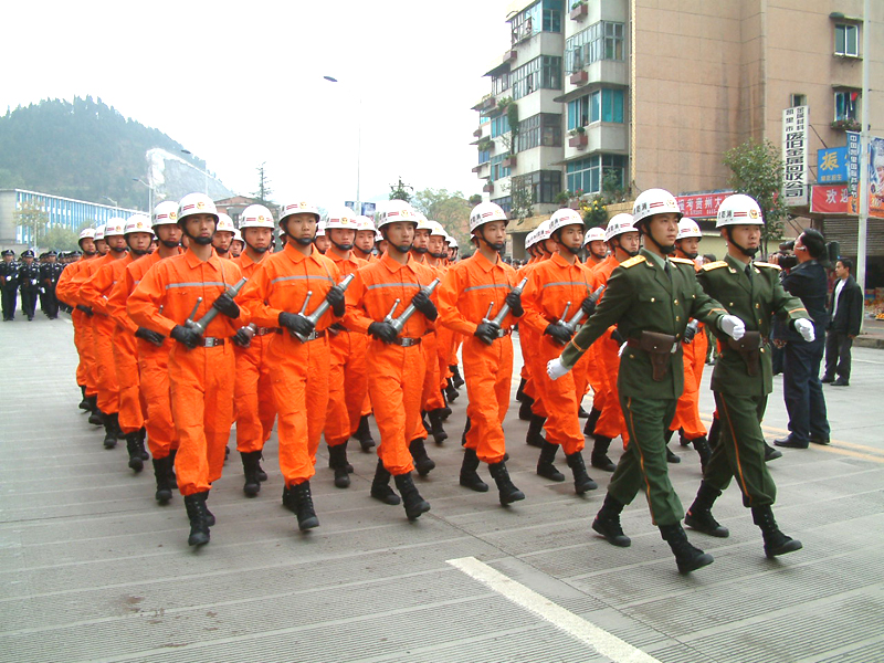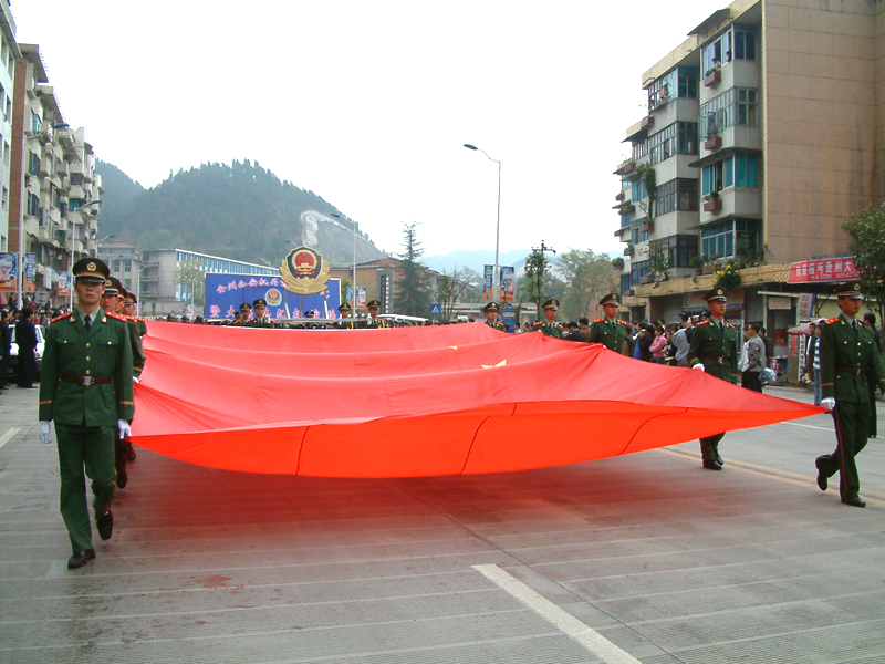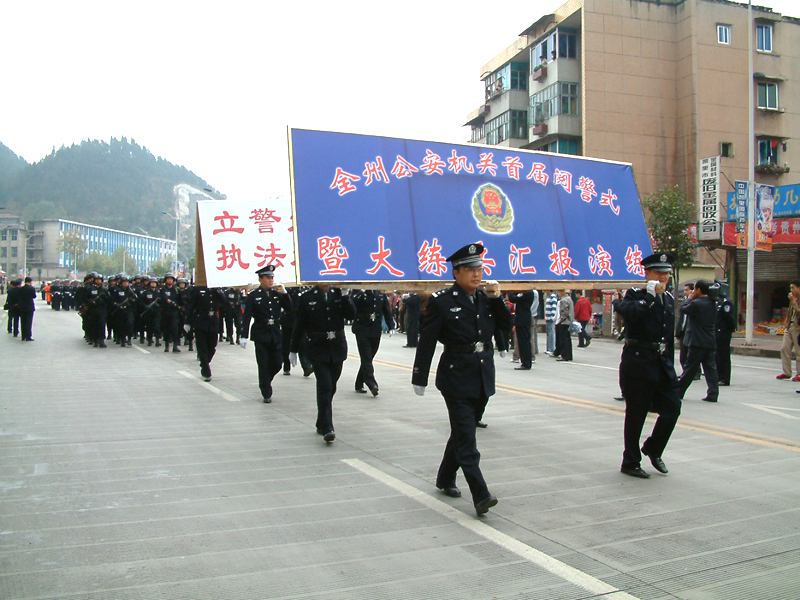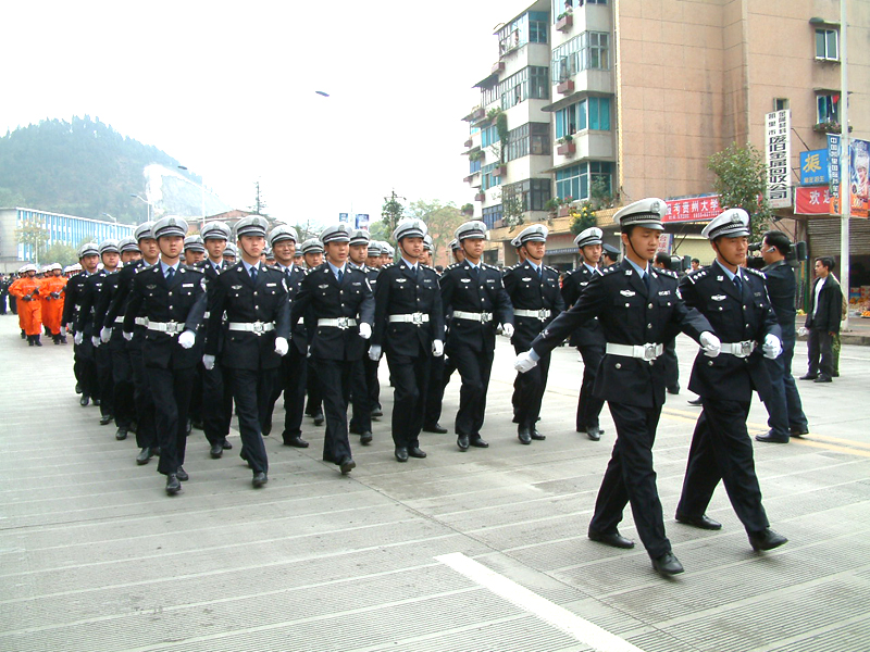 l2時50分各方隊在永華路州公安局路口列隊完畢。列隊川頁序按照摩托車護衛隊(呈三角形開道)、開道警車l車、新式警車10輛、國旗護衛隊、國徽盾牌、特警、交警、消防支隊、凱里市公安局……