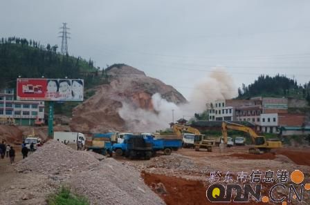 圖片新聞 5月10日下午5時55分,有關部門在凱里城郊苦里坳對一座高56的山坡實施大爆破。該山坡緊挨320國道,由于其阻礙了凱里城區至凱里開發區大道的施工建設,施工單位決定采用“開膛破肚”的方式進行爆破。據悉,該山頭還將進行2次大爆破,爆破產生的總砂石量約46萬立方米。爆破將山體“松動”后,將采用挖掘機進行挖掘,直至鏟平山頭。圖為記者在500米外拍攝的爆破一瞬。