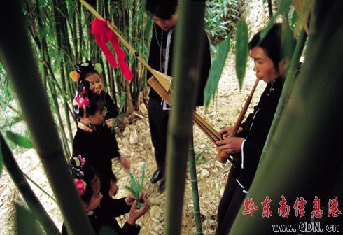 圖:姑娘小伙們在竹里跳蘆笙舞