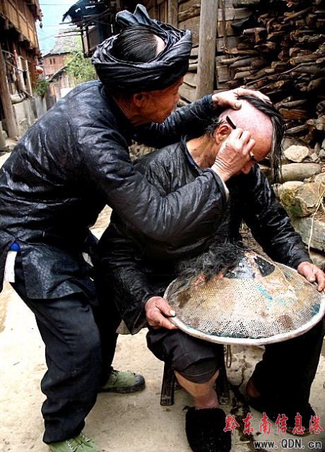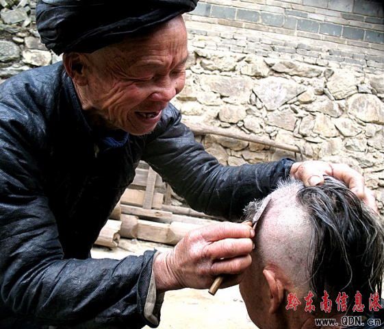 本港訊 黔東南從江縣高增鄉(xiāng)高增村,六十至七十多歲的侗族同胞保留古老的剃刀剃頭理發(fā)方式,并在頭頂蓄長(zhǎng)發(fā)。據(jù)了解,此理發(fā)方式已有600多年歷史,由于受當(dāng)?shù)仫L(fēng)俗影響,少數(shù)七十歲以上的老人至今仍然留著長(zhǎng)辮。圖為從江縣高增鄉(xiāng)高增村吳卜慶和吳卜金兩老人在相互理發(fā)。(特約記者 楊通榮 攝)