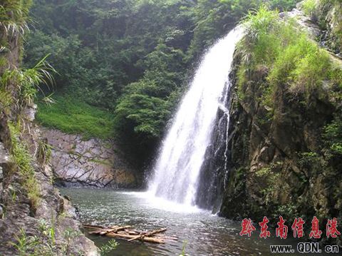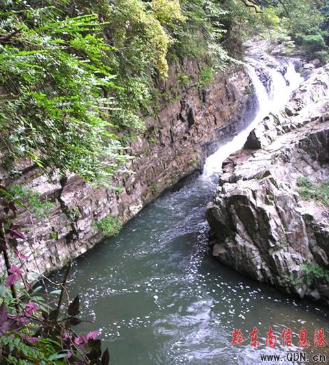 夢深塘位于寨子東北面,離寨子1公里遠的幽深峽谷間。瀑布下面是一個水潭,水潭的三面是峭壁,呈半封閉狀,東面、北面是上百米高的懸崖絕壁。瀑流、水潭和懸崖巧妙地組合,險峻、奇秀融為一體。瀑流投進水潭,然后折轉90度角,彎向西面狹窄幽深的峽谷之間,人從遠處看,不知道水出何處,還真以為瀑流投下深淵后,穿入山中去了。