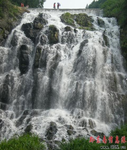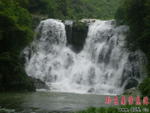 赧坎灘在寨子東面。兩條溪水在寨前匯合后,緩緩流過寨子側邊,朝東面的田壩淌500多米,再接納一條溪流,便無可憑依,陡然跌落。瀑布高33米,寬26米,是這九瀑布中最雄奇、最狀麗的一個。瀑流急劇撞擊在布滿棱角的巖石上,飛花碎玉般亂濺,揚揚灑灑地下墜,發出嘩嘩的音響。在瀑布的底端,形成一股強勁的風浪,白霧升騰,周圍的樹枝、野草被吹得搖搖擺擺,從不間歇。人置身于那里,那風浪拂面襲來,衣服、頭發也一個勁地向后翻動,涼爽濕潤的氣浪沁人心脾。