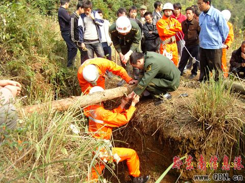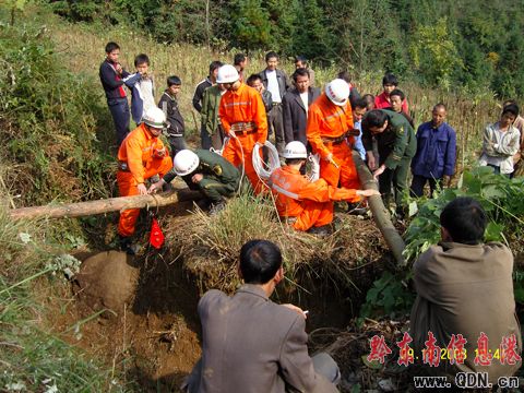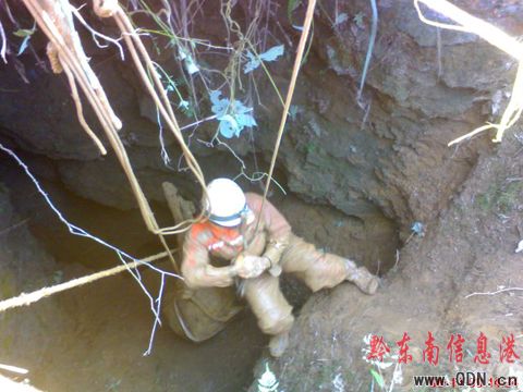 經(jīng)過半個多小時的驅(qū)車跋涉,救援人員安全抵達事故現(xiàn)場。通過詢問在場群眾及主人和堪查,具體情況是兩頭黃牛在打斗過程中掉入30米深洞內(nèi),因主人家的主要經(jīng)濟收入是靠兩頭黃牛維持,在救助小組到達之前,當?shù)氐娜罕娪美K子試圖營救,但由于洞口窄小加之對洞內(nèi)的情況不了解,器材不足,經(jīng)驗欠缺,準備不充分,解救未果。初步情況掌握后,教導員謝元君馬上現(xiàn)場指揮副中隊長劉毅對山洞周圍的情況進行勘察,并商量決定采取以往的方式進行救援:在洞口處架設(shè)固定木樁固定救生繩,先由中隊一級士官王飛配戴好個人防護裝備后攜帶救助器材到洞內(nèi)進行偵察。該同志下到離地面約15米洞內(nèi)一個平臺上進行偵察,發(fā)現(xiàn)該洞穴呈S斗狀,一直向下延伸,洞內(nèi)結(jié)構(gòu)復雜。并深入洞底經(jīng)偵查發(fā)現(xiàn)洞內(nèi)有兩頭黃牛一頭已經(jīng)死亡。偵查人員便向教導員謝元君報告,洞內(nèi)情況。收到該同志的報告后,教導員謝元君立刻命令將已經(jīng)死亡的牛先拉上去以便給第二步救援帶來經(jīng)驗,同時命令孟宗保下入洞內(nèi)協(xié)助王飛,孟宗保接到命令馬上佩戴好個人防護裝備后攜帶安全繩下到了洞底。