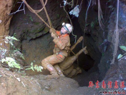 由于洞底是一個泥塘,在救助小組未到達現(xiàn)場時當?shù)厝罕娫诰仍臅r候繩索斷裂使黃牛陷入泥潭這樣給救援工作帶來了一定的捆難。這時洞下施救的兩名隊員經(jīng)過短暫的商量后,經(jīng)過20分鐘的努力下終于把繩索捆綁在黃牛身上,救援人員立即用對講機通知副中隊長劉毅讓上面的人將黃牛拉上去。就在拉的時候黃牛被卡住在了一個小的轉(zhuǎn)角處,由于轉(zhuǎn)角口較小小黃牛無法拉上去,救援人員立即向老鄉(xiāng)借來斧頭將轉(zhuǎn)角擴寬。經(jīng)當?shù)厝罕姾途仍藛T的努力下終于拉出一頭黃牛。有了第一次成功的救援經(jīng)驗第二頭黃牛很快的被營救回到地面,救援順利完成。