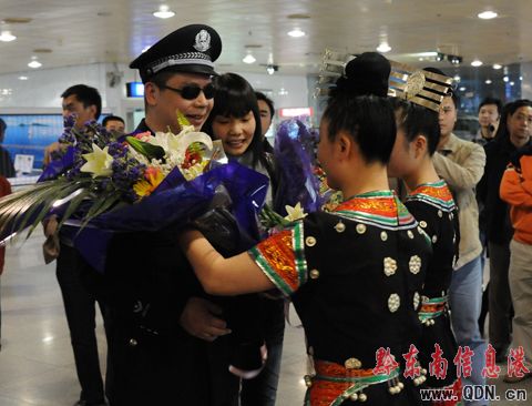 12月20日下午3點30分,應邀到北京做客專訪的我州入圍全國第三屆“我最喜愛的十大人民警察”候選人張秀昊,在妻子李蘭及省廳政治部、黔東南州公安民警的陪同下回到貴陽。省公安廳政治部副主任黎建新、黔東南州公安局局長溫貴欽、政治部主任魏肇成、天柱縣公安局局長黃先文到機場迎接。四名身著警服和民族服裝的女民警向英模獻上了鮮花。