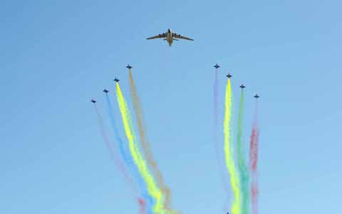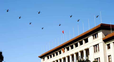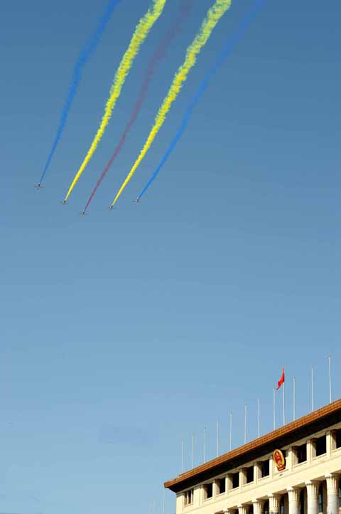 2009年9月21日上午11時(shí),北京晴空萬(wàn)里,參加國(guó)慶60周年閱兵空中梯隊(duì)在天安門廣場(chǎng)上空進(jìn)行精彩、完美預(yù)演。