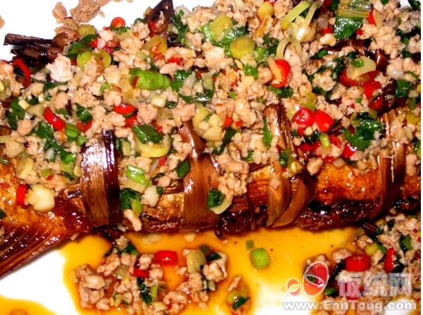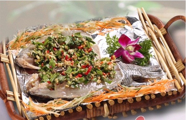 特點(diǎn):將處理好的白鯽魚加蔥、姜、蒜、青辣椒、芫荽、鹽腌制,然后喃咪(傣語(yǔ),意為“酸菜”等)放進(jìn)魚肚子里用香茅草葉捆好,用竹片夾涂抹過(guò)豬油的魚置于炭上烘烤,即成。香茅草烤魚鮮香酥脆,食之微辣回甜,食欲大增,其乃傣家招待賓朋的必備佳肴。
