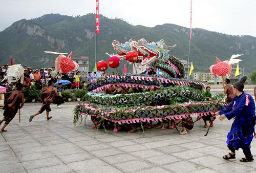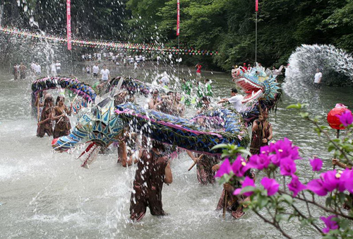 水龍,又名青龍,是施秉縣城關(guān)地區(qū)曾盛行的求雨祭祀活動。每逢天旱,當(dāng)?shù)厝罕姳阕园l(fā)組織起來舉行,整個活動時間為1至3天,走街串巷的舞龍,龍到之處,每家每戶用木盆、木瓢舀水潑龍。