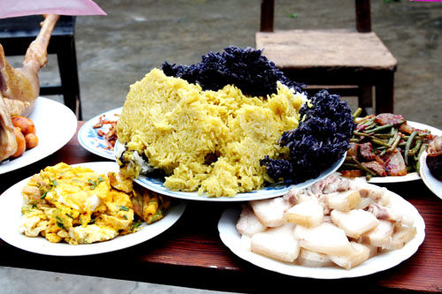 姊妹飯是用糯米做成的,青年苗女上山采集可食野生植物,取汁把糯米染成各種顏色,蒸熟后用手抓食。伴以腌魚、酸湯,香甜可口,風味獨特。