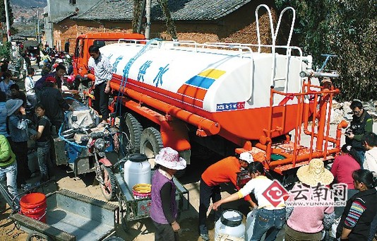 下午2時(shí)15分,記者又來(lái)到該縣鹿阜鎮(zhèn)山?jīng)_村委會(huì)唐家村,一輛印有“石林抗旱供水”字樣的桔紅色送水車開(kāi)進(jìn)了村,家家戶戶把大大小小、形形色色的水桶、塑料盆排成隊(duì)等待接水,拖拉機(jī)、三輪車、摩托來(lái)往穿梭運(yùn)水,大家挑的挑、抬的抬,一幅熱火朝天的供水場(chǎng)面。7歲的小朋友符艷麗高興地說(shuō),“終于有干凈的水喝啦,山上的水都挑干了,我一個(gè)多月沒(méi)洗澡了。”看著此情此景,大可鄉(xiāng)副鄉(xiāng)長(zhǎng)曾躍祥欣慰地說(shuō),“群眾看到黨和政府及社會(huì)各界幫助大家抗災(zāi)救災(zāi),深受感動(dòng)。我們一定能戰(zhàn)勝災(zāi)害渡過(guò)難關(guān)。”