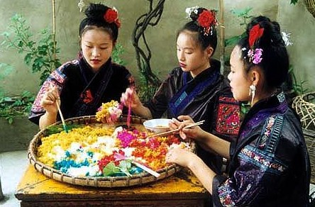 每逢農(nóng)歷三月十五,苗寨里都準(zhǔn)備好五顏六色的姊妹飯,歡天喜地地過(guò)姊妹飯節(jié)。姊妹飯是用糯米做成的,用不同的糯米再經(jīng)過(guò)加工處理后就成了五顏六色的姊妹飯了。在這一天,如果有外寨的后生們來(lái)作客,會(huì)得到姑娘們的熱情招待。臨別時(shí),小伙子向姑娘討姊妹飯,姑娘便用藍(lán)子或新帕子盛滿(mǎn)姊妹飯送給小伙子,飯中往往藏入了姑娘心中的暗示標(biāo)志——“謎子”:如果藏的是松針葉,即是示意后生要用繡花針和絲線(xiàn)酬謝姑娘;如果藏的是一對(duì)筷子或紅花瓣,那就叫小伙子快點(diǎn)張羅把自己娶過(guò)門(mén)了;如果飯里藏的是辣椒或大蒜,告訴小伙子彼此不合緣,請(qǐng)不必徒費(fèi)心機(jī)了。