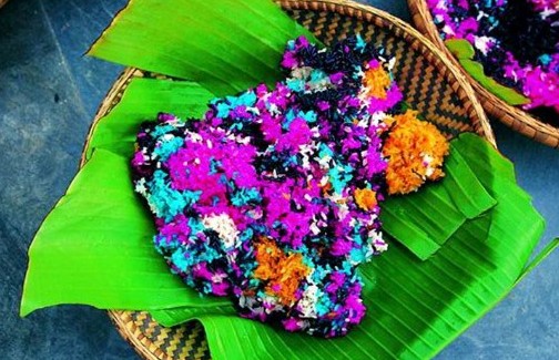 這種飯是用姑娘們在山上采集的野花和葉把糯米染成五顏六色后蒸成的。在這些日子里,按照海南苗家的傳統習俗,要吃姊妹飯。