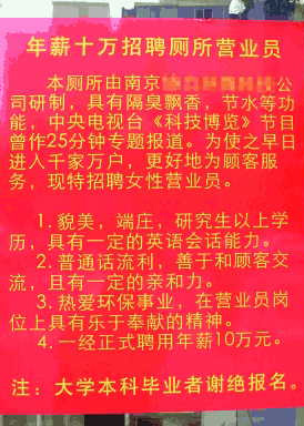 —邊是年薪十萬的誘人待遇,—邊是限貌美、研究生學歷的高門檻,最關鍵的是崗位,竟是看管廁所。南京洪武北路上—家新開張的潔具銷售廳就打出了這樣—則雷人的招聘啟事,引來了不少質疑之聲。(4月30日長江日報)