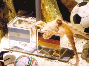 據說,章魚哥判斷每場足球賽的結果,是根據這些國家國旗圖案來判斷的。不知道是否科學,反正章魚哥創造了神話,它預測到了每場比賽的結果。在英格蘭、法蘭西等傳統強隊球迷意氣風發時,章魚哥根本不買賬,預測年輕的日耳曼軍團將過關斬將,結果自然讓那些志得意滿的強隊球迷大跌眼鏡。章魚哥畢竟是章魚哥,你不得不佩服章魚哥的奇幻魅力。