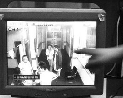 昨日中午,蘇秀云老人的親屬在監(jiān)控錄像上指認(rèn)值班醫(yī)生(身披深色大衣的男性)。 記者 劉紅濤 攝