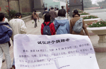 啟事內容非常奇特:“誠征卵子捐贈者,要求身高1.6米以上,年齡18—28歲女性一名,婚否不限,身體健康、勻稱、五官端正、中專以上文化,聰明善良,有愛心、血型為A型或B型者佳,無家族遺傳病史、無傳染病、精神病者,一次性酬謝人民幣8000———10000元。”