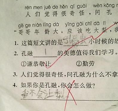大凡每個中國人都知道“孔融讓梨”的故事,《三字經》中“融四歲,能讓梨”就說的這個故事。現在的小學課本也有“孔融讓梨”這篇課文。這個故事旨在教育人們凡是應該懂得謙讓的禮儀。孔融說,樹有高低,人有老幼,尊老敬長,為人之道也!更是彰顯了中華民族的傳統美德。從這個角度看,小學生回答試題“孔融讓梨我不讓”令人有些失望,作為老師給這樣的答案一個大大的紅叉,應該沒有錯。因為,教育學生養成良好的美德,也是教師的責任。