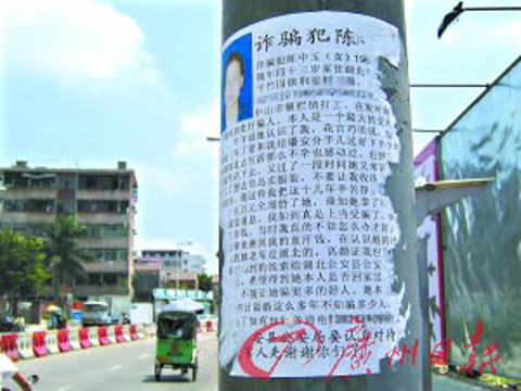 韓先生表示,事后他才知道,該女子和她在一起時身份都是假的,“她說自己叫陳梅,其實她的名字是陳某某。”直到這個女子杳無音信,韓先生稱“自己才知道上當受騙了”。在再三尋覓無果的情況下,他無奈在中山各地張貼“通緝令”�!拔矣×�100多張,貼了60多張。”