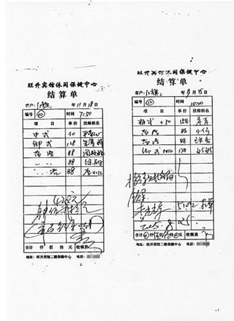 服務(wù)臺下面有一本旺升賓館休閑保健中心結(jié)算單,記者拿過來看了一下,發(fā)現(xiàn)其和網(wǎng)上出現(xiàn)的結(jié)算單完全一樣。網(wǎng)上出現(xiàn)的保健中心結(jié)算單的服務(wù)項(xiàng)目里有“梅式”、“御式”字樣,它們指的是什么?“梅式就是西式保健,御式就是泡澡。”中年女子說。怎么泡澡?“把衣服全脫了”,服務(wù)臺后面一個(gè)稱自己同樣做泡澡服務(wù)的紅衣女子說。網(wǎng)上出現(xiàn)的結(jié)算單有些項(xiàng)目后面還出現(xiàn)了“梅式+50”的字樣,“+50”是指什么?中年女子回答“是小費(fèi)嘛”。