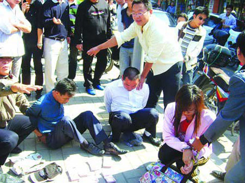 隨后,“綠襯衫”和“ 白襯衣”湊了上來,三人進行交換,而穿粉色衣服的女孩則早已攔住出租車在旁邊等候。“交易”成功之后,三人打車揚長而去,民警迅速追上去,將兩男一女堵在車內,然后又把老太太叫了回來。