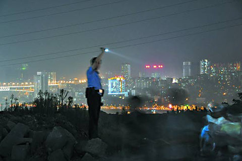 在發帖人“張力”的照片中可以看出,當時天色已黑,聚集在此觀看焰火的市民正紛紛離去,一隊民警則開始有秩序地維持現場,并為市民引導。網友“張力”稱,在9月30日晚,國慶焰火晚會結束后,江北城很多民警都是舉著電筒為群眾指路的。其中還有一位警察站在一塊大石頭上面,一直高舉著手電筒。一直舉了將近2小時,直到群眾完全離去。網帖發出后,立即引來眾多網友點擊,很多網友都表示這樣的民警簡直太讓人感動了,簡直就是“燈塔”。