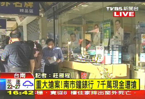 據臺灣TVBS報道,臺南市一家鐘表行老板,23日下午到銀行提領新臺幣7000萬元現金,準備買黃金用,沒想到回家途中遭歹徒尾隨,回到店內時歹徒開槍搶走現金,流彈還意外波及在店內的老板侄女,侄女小腿中彈,送往成大醫院急救,歹徒則逃逸無蹤。 今天下午2點多,臺南市一家鐘表行老板到銀行提領7000萬元現金,要回店里交易黃金,回程途中疑似被歹徒盯上,趁著老板下車到后行李箱拿錢袋時,歹徒掏槍行搶,老板第一時間和歹徒發生拉扯。