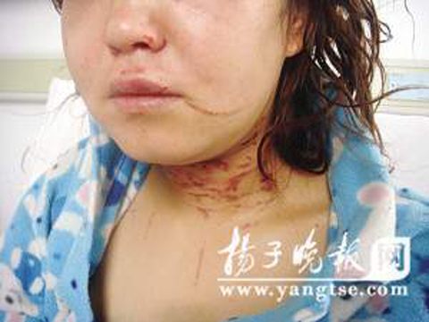 在飯店時,記者看到收銀臺旁貼了兩張“美女照”,劉剛很自豪地告訴記者,這就是老板阿花,不少來吃飯的客人夸老板像歌星。而當記者在鎮江第四人民醫院骨科病床上看到阿花時,一時真難和照片上的人對上號。阿花面部腫大,眼睛無法張開,嘴唇也腫了,兩手也滿是傷痕。最讓人驚心的還是她的脖子,已很難找到一塊完整皮膚。一直陪伴著妻子的阿斌,向記者出示了妻子的手機,手機屏已被打碎。